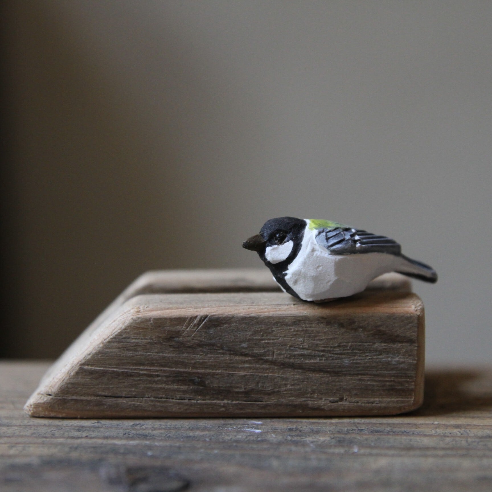 ミニサイズのシジュウカラの彫刻。古材の台座付きです。