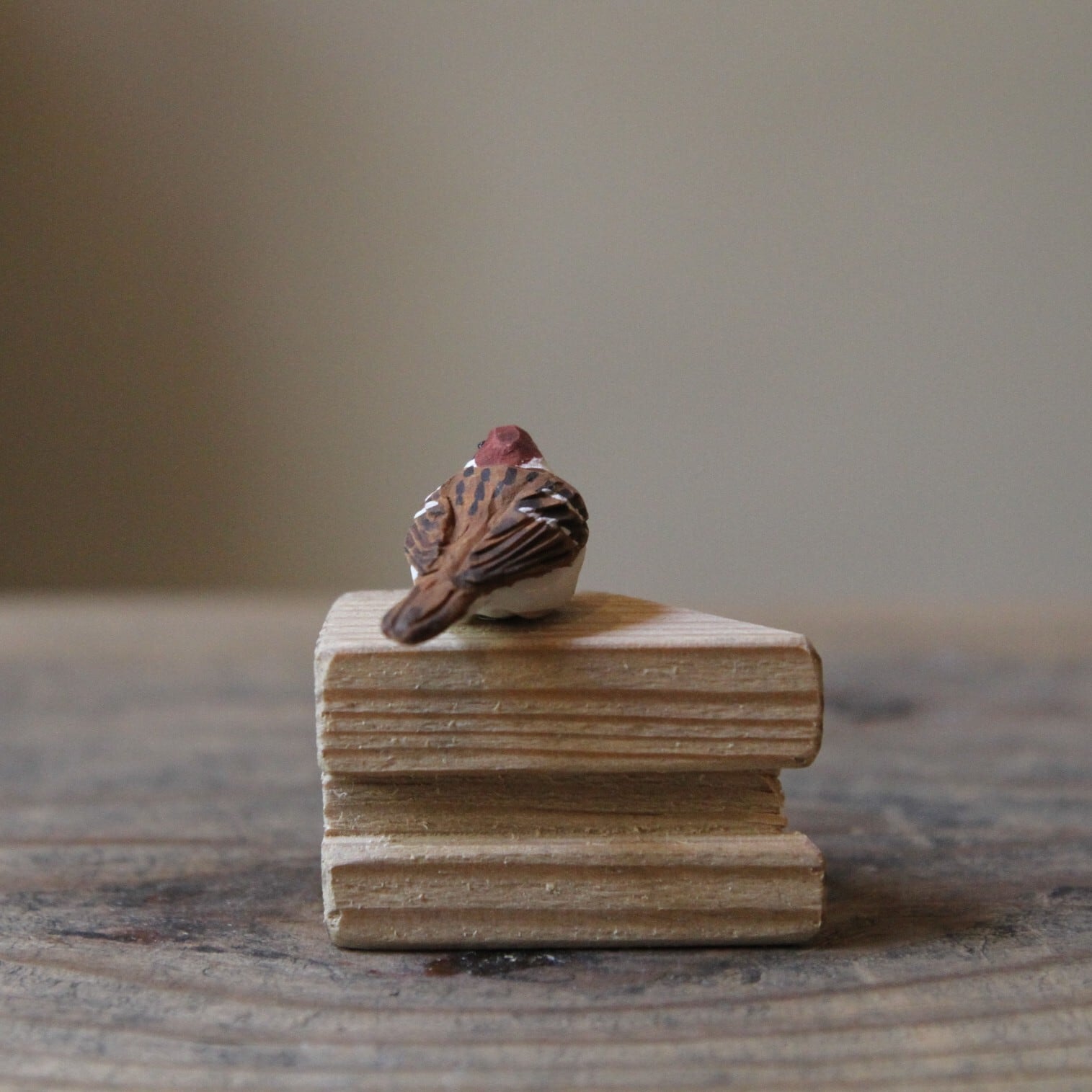 ミニサイズのスズメの彫刻。古材の台座付きです。