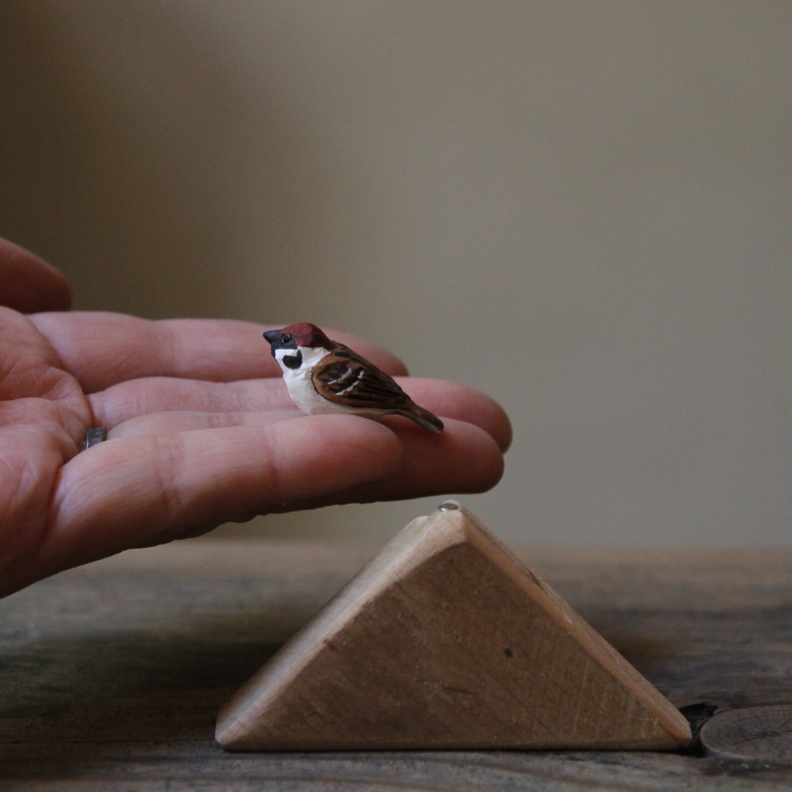 ミニサイズのスズメの彫刻。古材の台座付きです。